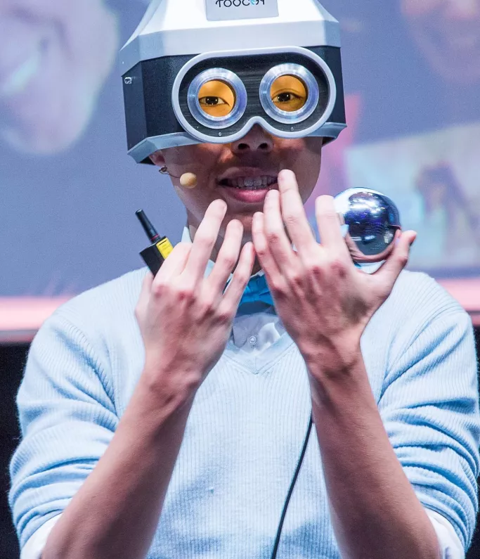Worn as a helmet, Touchy’s ‘eyes’ (in the form of camera shutters) stay closed, preventing the wearer from seeing the world around them. Only when someone touches the person wearing Touchy do the ‘eyes’ automatically open, and in doing so they take a digital photograph from Touchy’s viewpoint, which is displayed on the rear of the helmet.